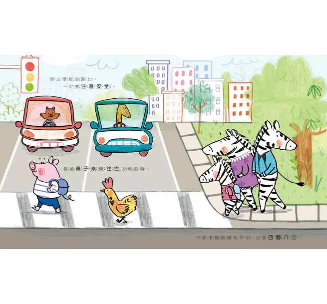 斑馬、小雞、小豬穿越馬路時,