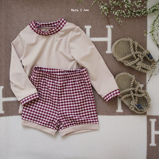 格長袖配短褲拼防曬泳衣套裝